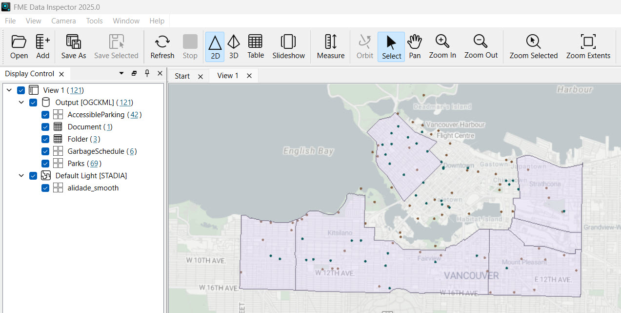 Jennifer downloads the data, extracts the zip folder, and inspects the data in FME Data Inspector. This confirms that the workspace runs as she expects, so she can safely turn it into a Workspace App now.