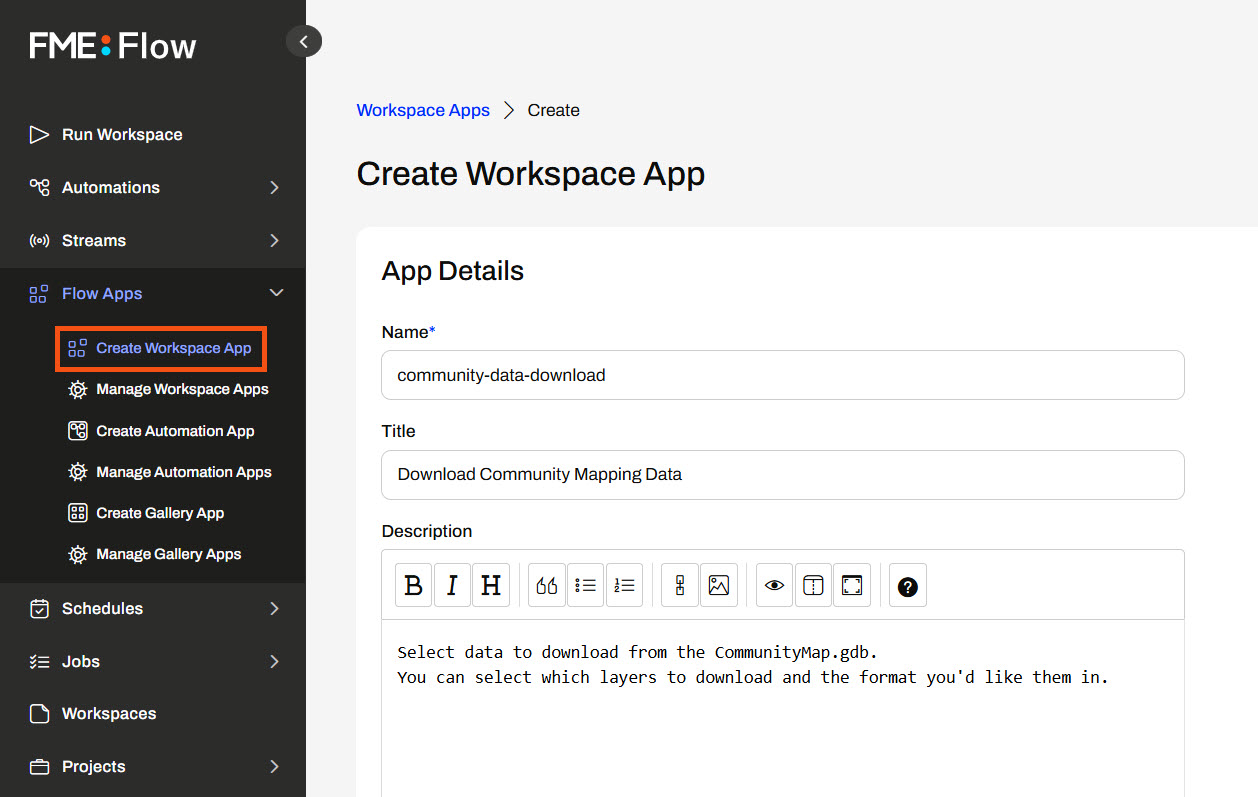 Jennifer navigates back to FME Flow and opens Create Workspace App. She names it community-data-download and gives it a title and description.