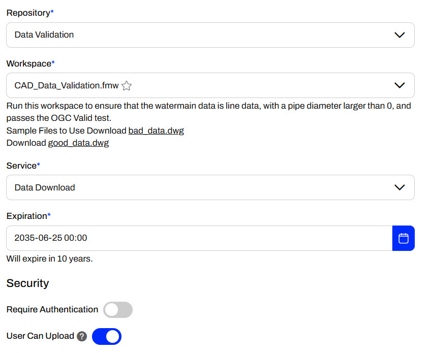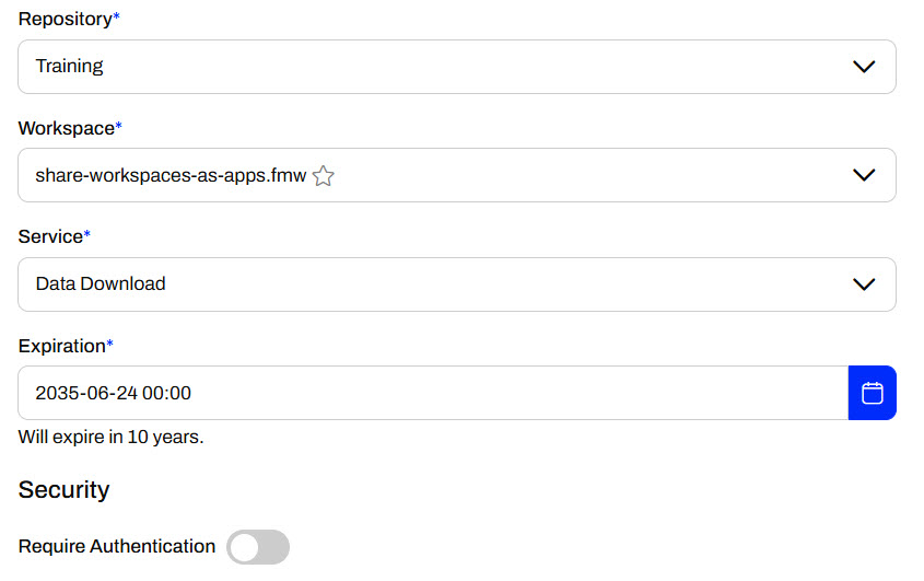 After you provide your App a name, title, and description, you must select the workspace and service with which it will run. By default, Apps will expire in 10 years; you can modify this setting, though. You can Require Authentication for your App, meaning users will need to log into FME Flow to access the App. If you want your App to be publicly accessible, you should leave Require Authentication off; anyone with the link to your App can access it, as long as there's no network or firewall interference between them and your FME Flow.