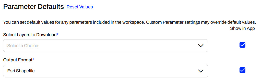 Next, Jennifer expands Parameter Defaults to configure the workspace's published parameters. She leaves both selected to show in the app. Jennifer doesn't specify any default value for Select Layers to Download and assigns Esri Shapefile as the default Output Format because she predicts it will be a popular format.