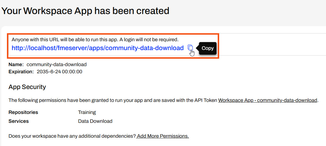 After you create your App, FME Flow will present you with the URL and security details. You may copy the App URL to share it, or open it in the browser by clicking the link.
