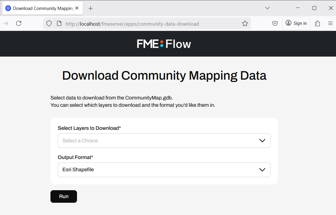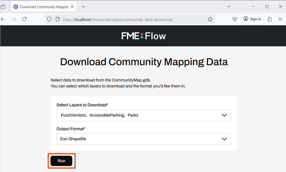 To ensure her workspace works as expected on FME Flow, Jennifer goes to the Run Workspace page and configures it to run. She uses the Data Download service, selects a few layers to download, and selects an output format.