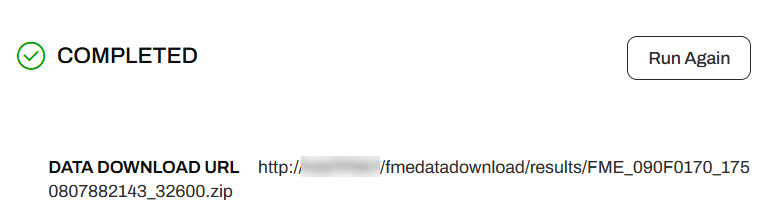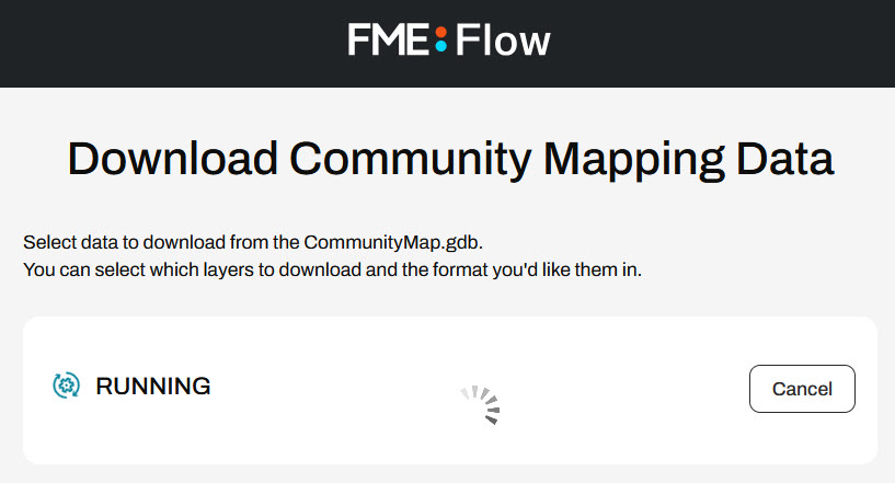 Like running a workspace, the App displays as Running while the FME Engines process the workspace. Once complete, the App presents the user with the Data Download URL.