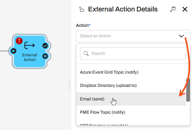 Sven opens the External Actions Details and selects the Email (send) action.