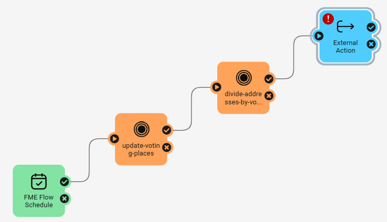 Sven, a planning analyst, is building an Automation to update election voting location information. He has two workspaces: one that updates a SpatiaLite database with electoral divisions and voting places, and another that assigns voting division IDs to addresses. He runs these workspaces consecutively, in order, as the second workspace relies on data updates from the first workspace.