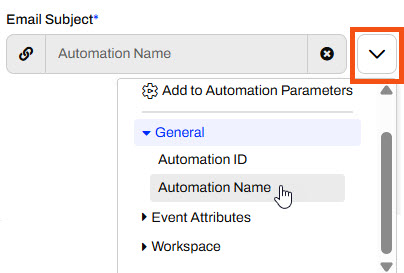 Sven uses the drop-down arrow for the Email Subject to select the Automation Name.