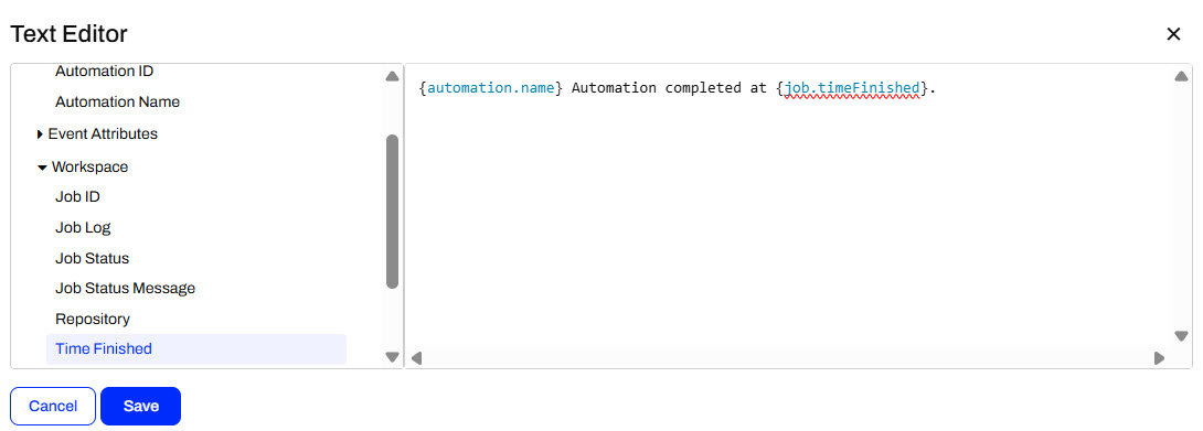 For the Email Body, he uses the drop-down to select the Text Editor. He configures a message to send to himself using attributes on the left to customize it. He clicks Save to close the Text Editor.