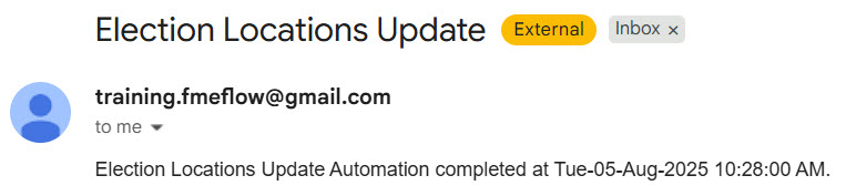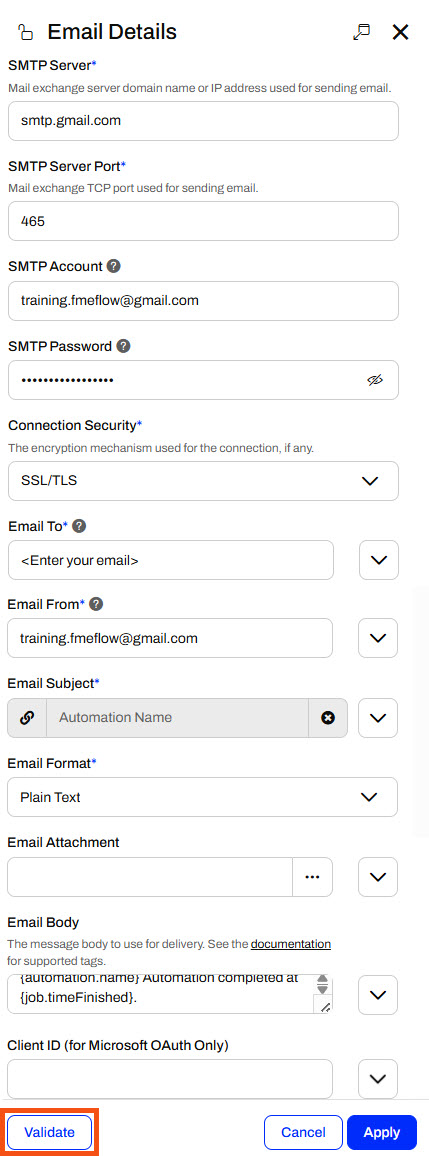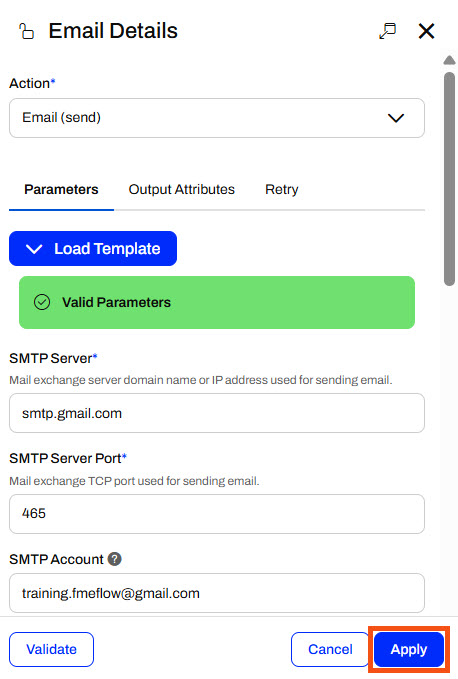 Sven enters his email for the Email To parameter and uses training.fmeflow@gmail.com for the Email From parameter.