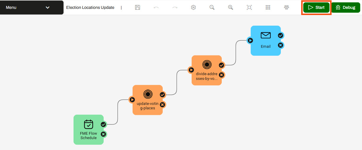 Both workspaces ran, and Sven saw that the second workspace did not begin to process until the first workspace was finished. Sven expects this as he wants the addresses to update with the newest voting division data from the first workspace.