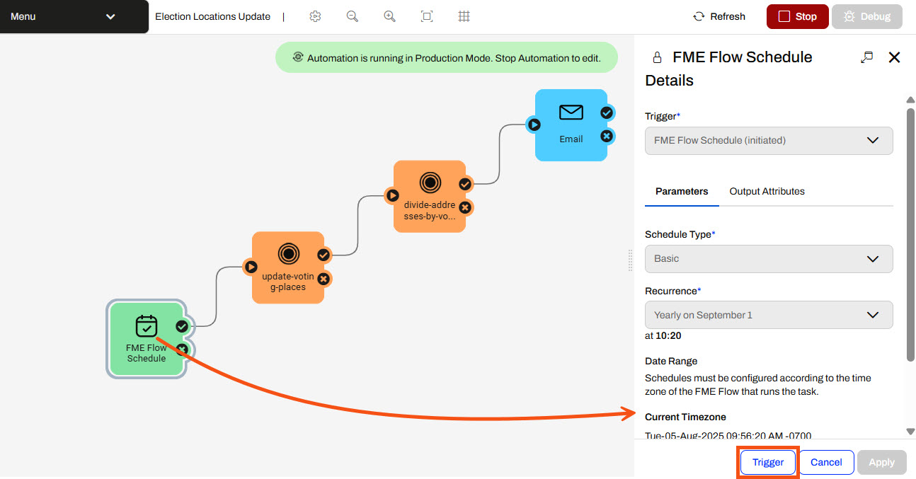 The Automation will run only on the scheduled date and time, so Sven will trigger it manually to test it. He opens the FME Flow Schedule Details and clicks Trigger.