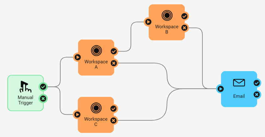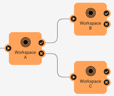 In this example, Workspace B runs if Workspace A succeeds, while Workspace C runs if Workspace A fails.