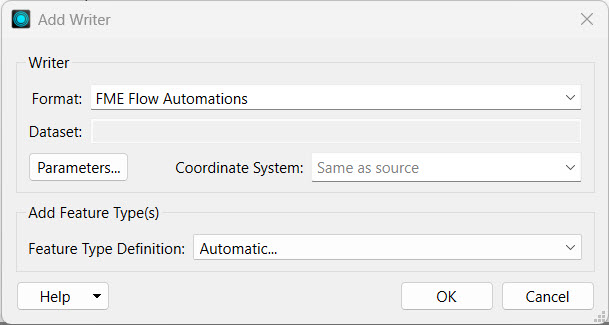 Jennifer clicks Writer on the top toolbar to open the Add Writer dialogue. For Format, she selects FME Flow Automations. She ensures the Feature Type Definition is set to Automatic... and clicks OK.