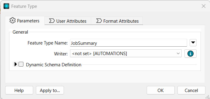 FME prompts Jennifer to configure the Feature Type. She sets the Feature Type Name to JobSummary and clicks OK.