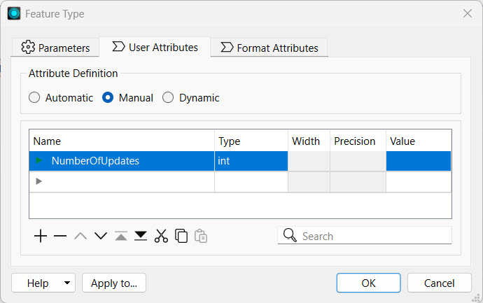 After she connects the writer feature type to the Aggregator, Jennifer notices that all the attributes from the shapefile are included in the writer. She doesn't need all the information in the Automation, so she will remove some attributes. She double-clicks the JobSummary writer feature type and goes to the User Attributes tab. She changes the Attribute Definition to Manual and manually removes all the attributes except for the NumberOfUpdates.
