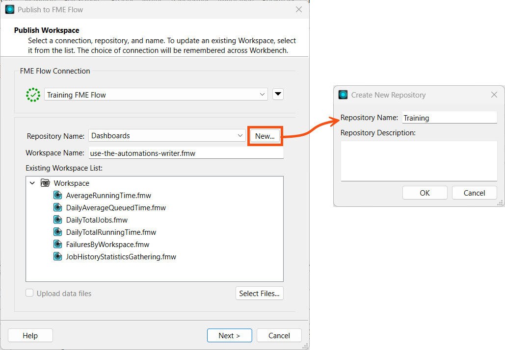 Jennifer selects the Training repository. If it doesn't exist, she clicks New... and adds a new repository named Training.