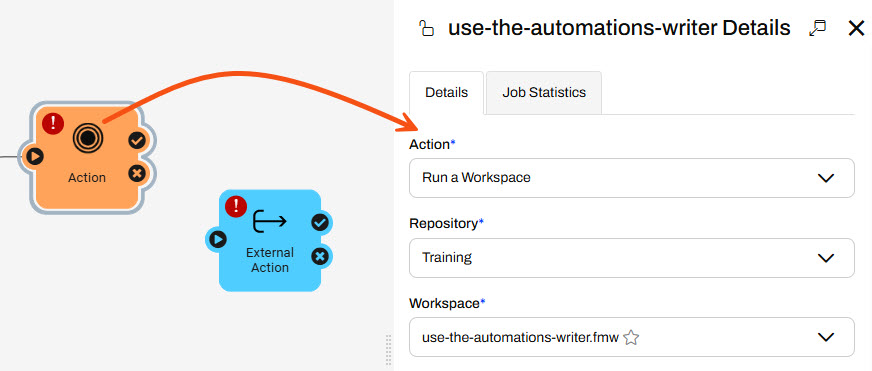 Jennifer clicks on the Action icon to open its details. She sets the action to run the use-the-automations-writer.fmw workspace she published to the Training repository.
