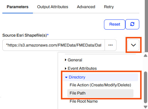 For the Source Esri Shapefile(s) parameter, Jennifer selects the File Path attribute in the Directory expandable section using the drop-down menu.