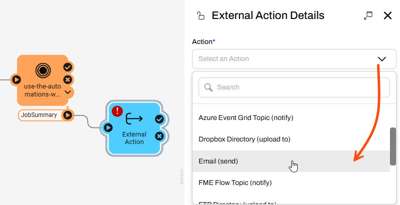 Jennifer connects the external action to the JobSummary port and opens the external action details. She selects the Email (send) action.
