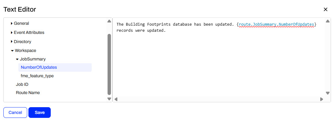 To add the {route.JobSummary.NumberOfUpdates} parameter, Jennifer expands the Workspace and JobSummary tabs and selects NumberOfUpdates.