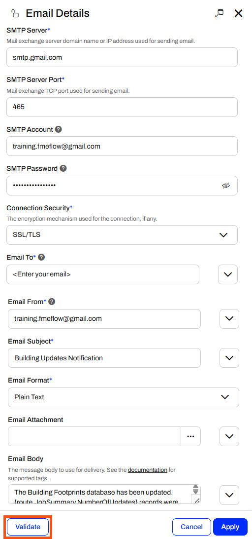 Jennifer enters her email for the Email To parameter and uses training.fmeflow@gmail.com for the Email From parameter.
