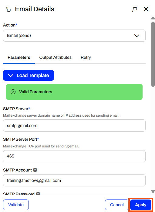 Jennifer will configure the action to use a Gmail account, so she selects Gmail using the Load Template option and pre-populates some of the SMTP parameters.