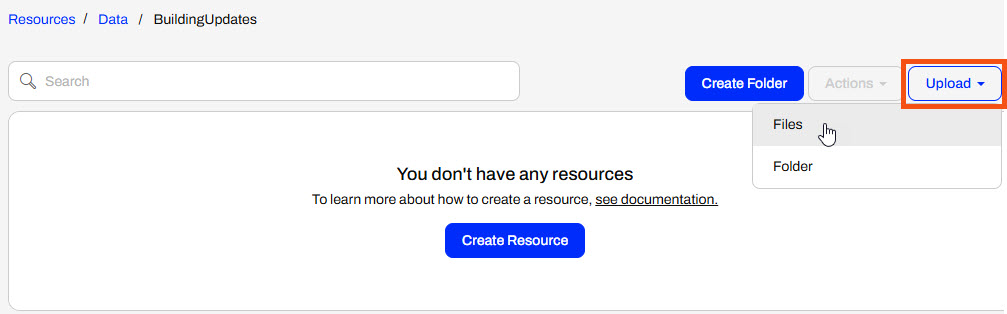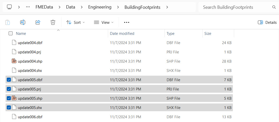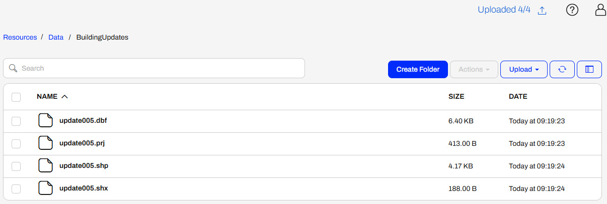 With her Automation running, Jennifer navigates to Resources > Data > BuildingUpdates and uploads all four files of a shapefile of updates (C:\FMEData\Data\Engineering\BuildingFootprints).
