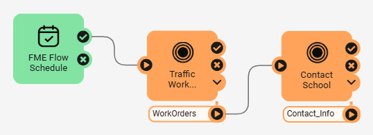 For example, the WorkOrders port in this workspace outputs features for work orders in school zones that have not yet been processed. If twenty features are passed through the port, the Contact School workspace will run twenty times to process each work order.