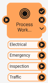In this example, the workspace processes work orders and filters them based on their type. For each run of the workspace action, multiple features may be sent through each port, which will likely run different workspaces downstream according to their type.
