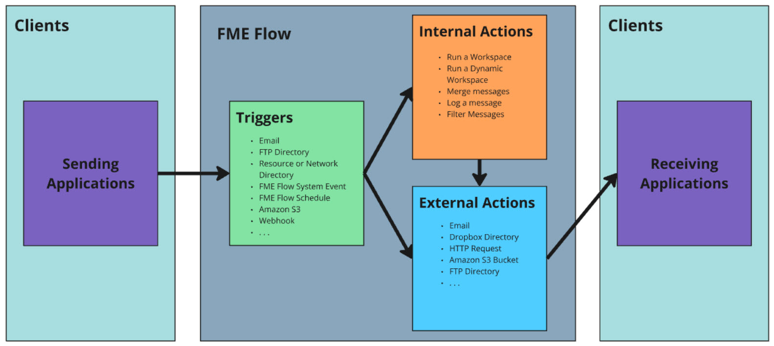Actions perform functions internally on FME Flow or send outgoing notifications to clients. Again, the exception is an FME Flow Topic, where the receiving client is FME Flow to instigate other workflows, instead of an external client.