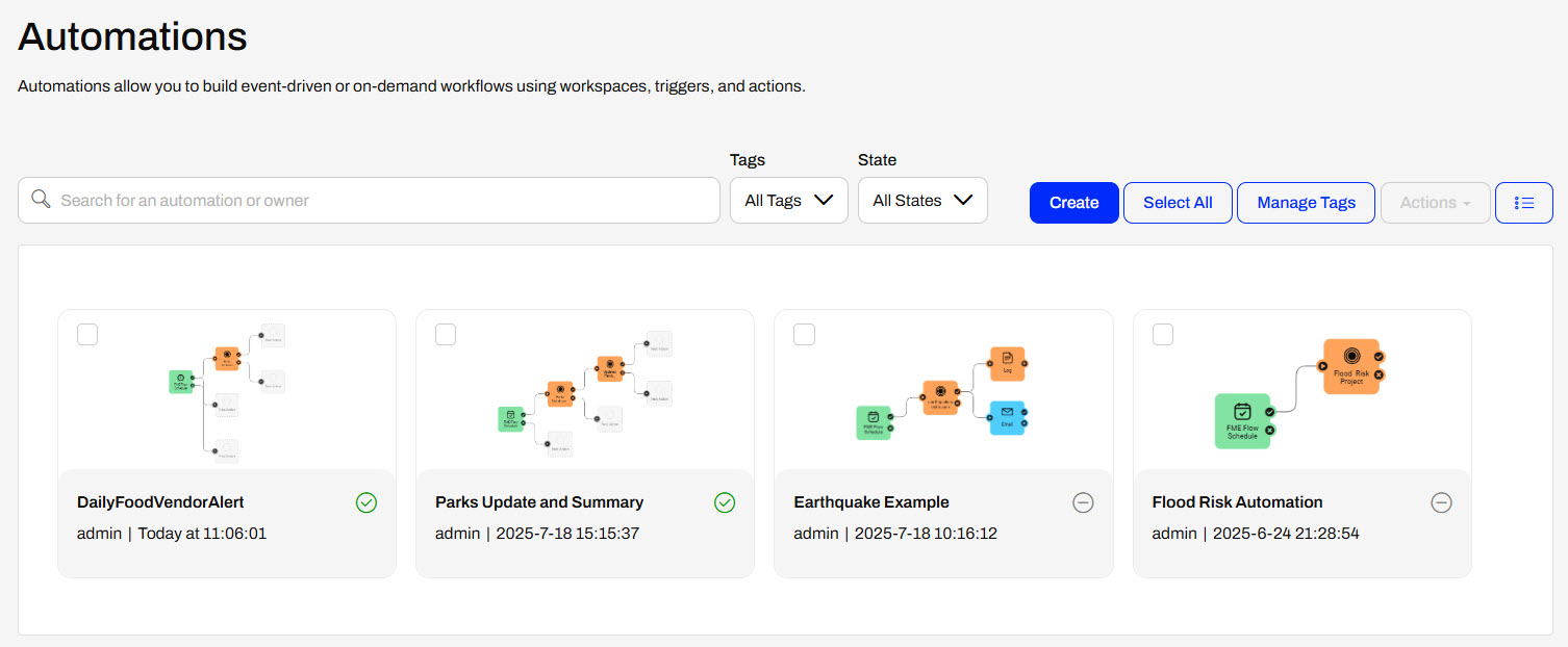 You can view and manage Automations on FME Flow from the Manage Automations page. FME Flow lists all Automations you can access and displays some details and statistics. You may search Automations by name and user, or filter by Tags or State (whether it's started or not). You can see details about each Automation in the columns from the list view, such as whether it's started and the owner.