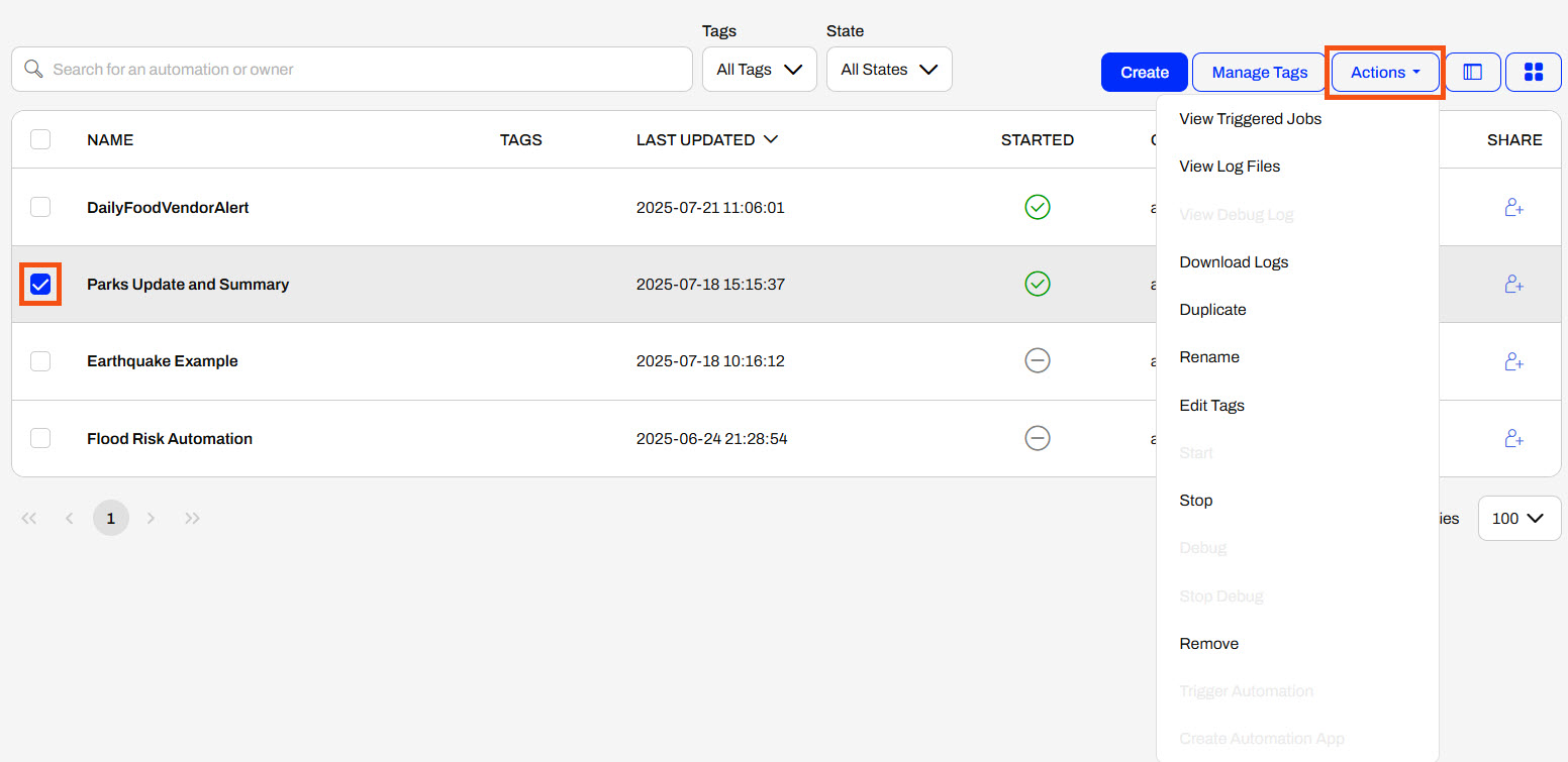 When you select an Automation, you can perform additional operations from the Actions drop-down menu. You may start or stop an Automation, view triggered jobs and log files, and perform other actions without opening the Automation itself. Whether you view your Automations as a list or grid, these options are the same.