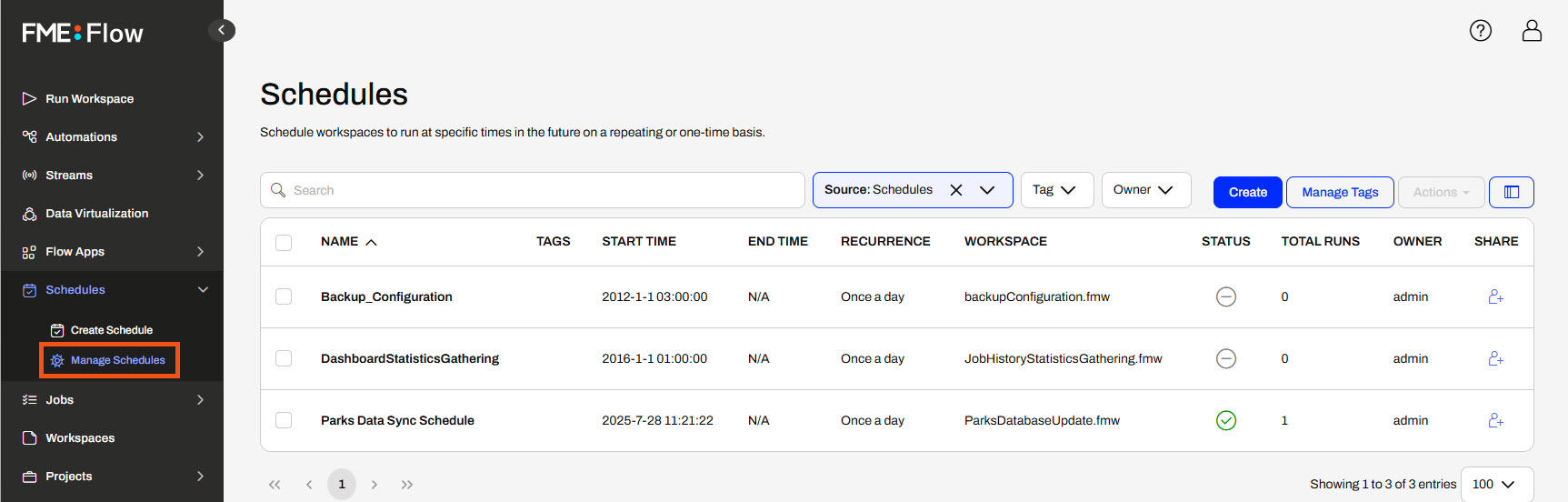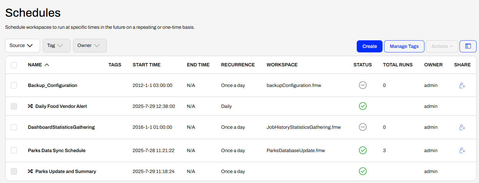 Like Automations, the Manage Schedules page displays a list of Schedules on FME Flow and some information about them. You may see the recurrence interval and the workspace running on the schedule.