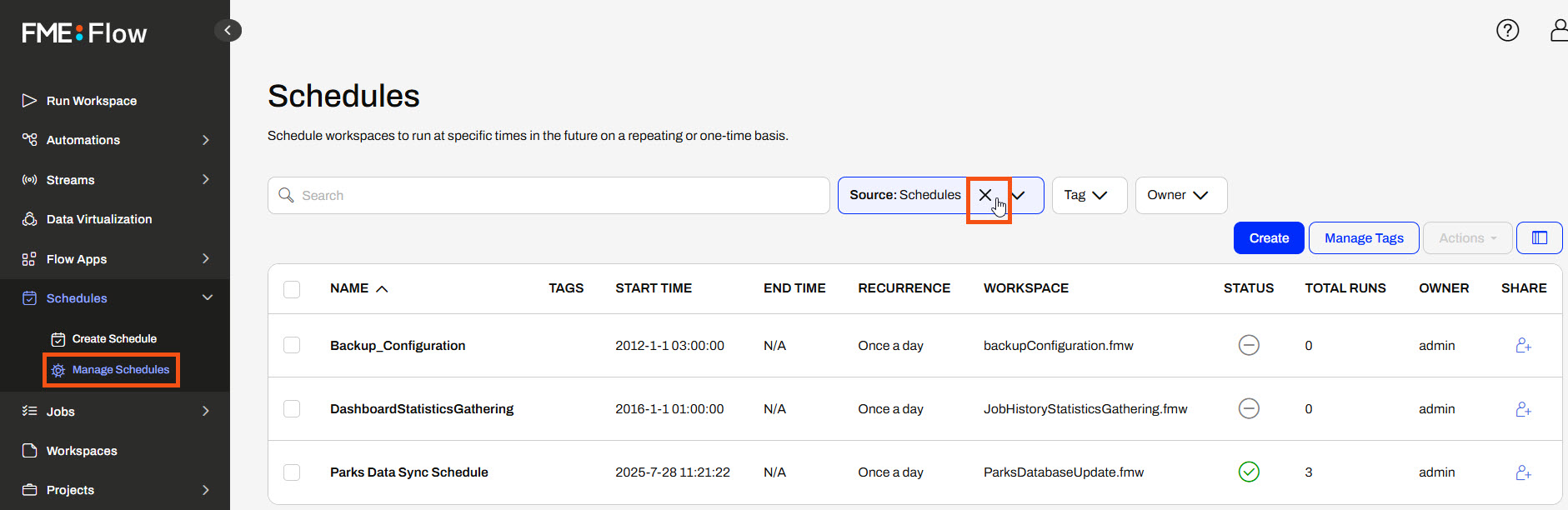 Manage Schedules on FME Flow has an additional filter option, Source. By default, FME Flow selects Schedules for you. You can use the drop-down to choose Automations, which returns all Automations that use a Schedule trigger.