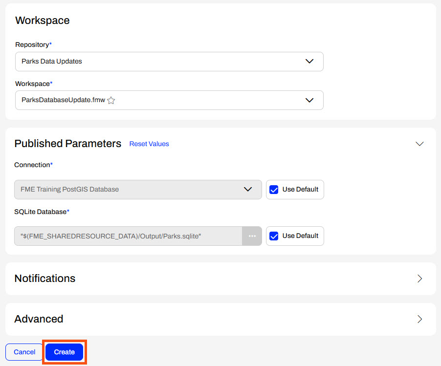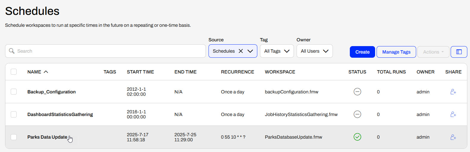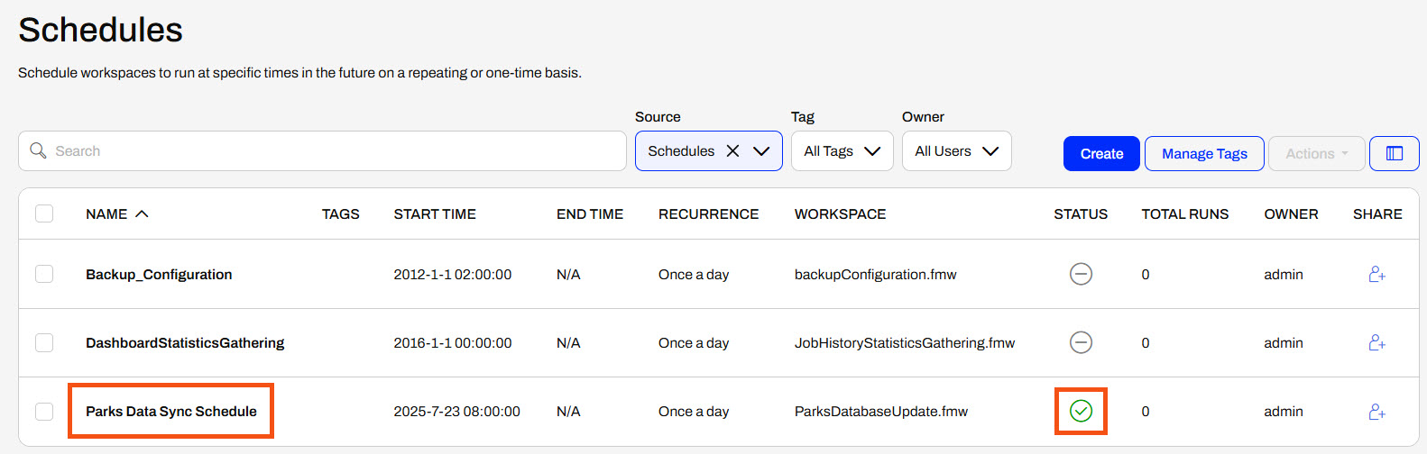 Jennifer, a GIS specialist in a city's GIS department, frequently runs a workspace to update Parks data between two databases. Her workspace reads Parks data from a PostGIS database and updates a SQLite database with the data. Jennifer tries to remember to run it daily, but sometimes she forgets. To avoid data inconsistencies and ensure the SQLite database is consistently kept up-to-date, Jennifer will configure this workspace to run on an FME Flow Schedule.