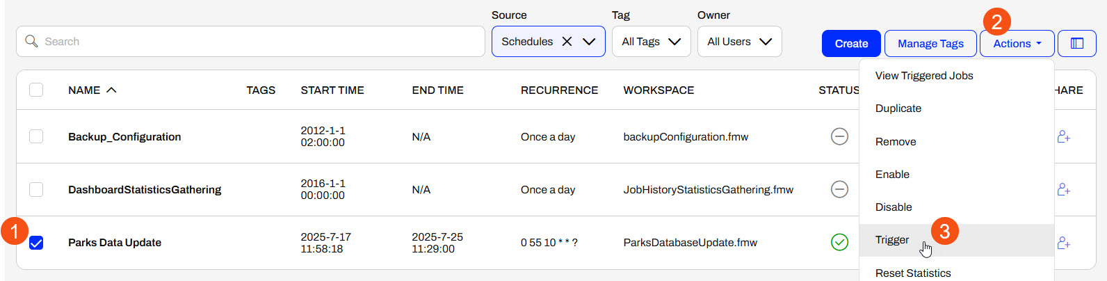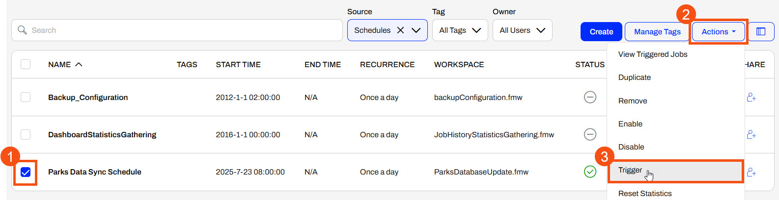 You may test your schedule before FME Flow triggers it to run, giving you more confidence that the workspace will function on the schedule as you expect. From the Manage Schedules page, click the box to select your schedule, expand the Actions options, and then select Trigger. FME Flow will immediately submit the workspace to run as you configured it in the schedule.