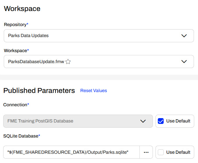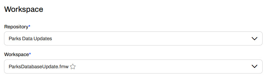 To set the workspace you want to run on the schedule, select the repository housing the workspace and then the workspace itself. If the workspace has any Published Parameters, a new section will appear for you to configure the parameter values you'd like the workspace to use when running on the schedule. FME Flow automatically selects the Use Default option for the parameters. You may deselect it and configure a different parameter value.