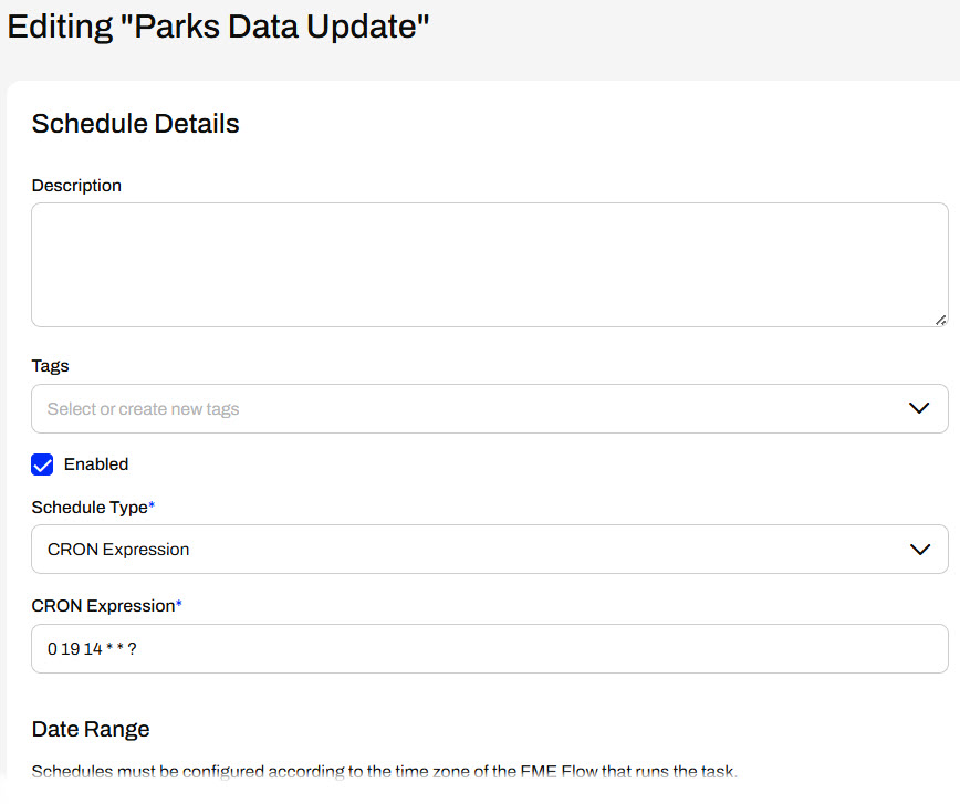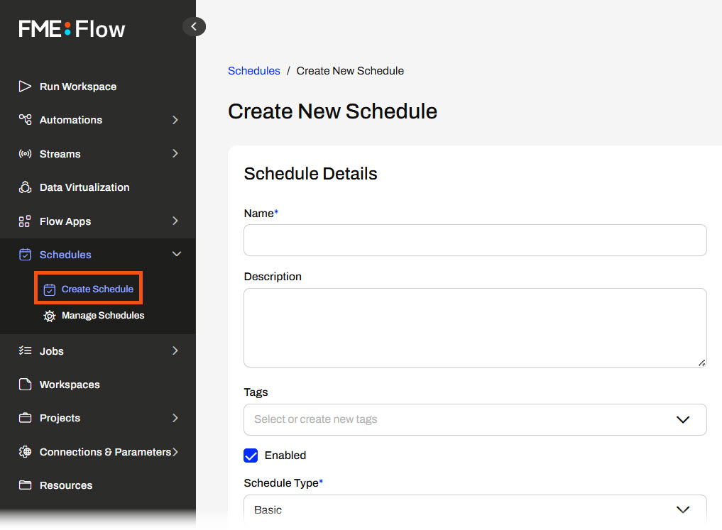 The Enabled option determines whether the Schedule will run actively. If you select Enabled, it will run on the schedule you configure as soon as you finish creating it. If you do not select Enabled, FME Flow creates the Schedule, but FME Flow will not actively monitor and run it.
