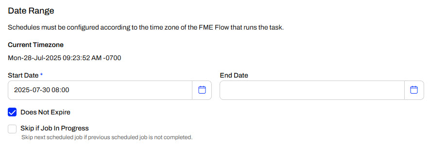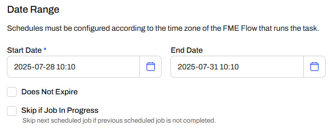 The following section allows you to set a date range for FME Flow to run the schedule for all Schedule Types except Only Occur Once. You enter the date and time for the schedule to start running the workspace, and optionally, enter a date and time when FME Flow will stop running the schedule. You can select Start Immediately to begin running the schedule as soon as you finish creating it. Likewise, you can choose the Does Not Expire option if you want the schedule to continue to run until you manually stop it.