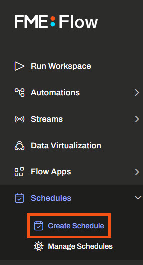 To create a Schedule to run a workspace, expand Schedules on the side menu and select Create Schedule. A form opens for you to fill out to choose your workspace and set your schedule.