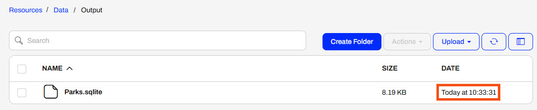 FME Flow triggers the schedule and runs the ParksDatabaseUpdate.fmw. Jennifer navigates to Resources > Data > Output and ensures the timestamp of the Parks.sqlite database shows it was recently updated.
