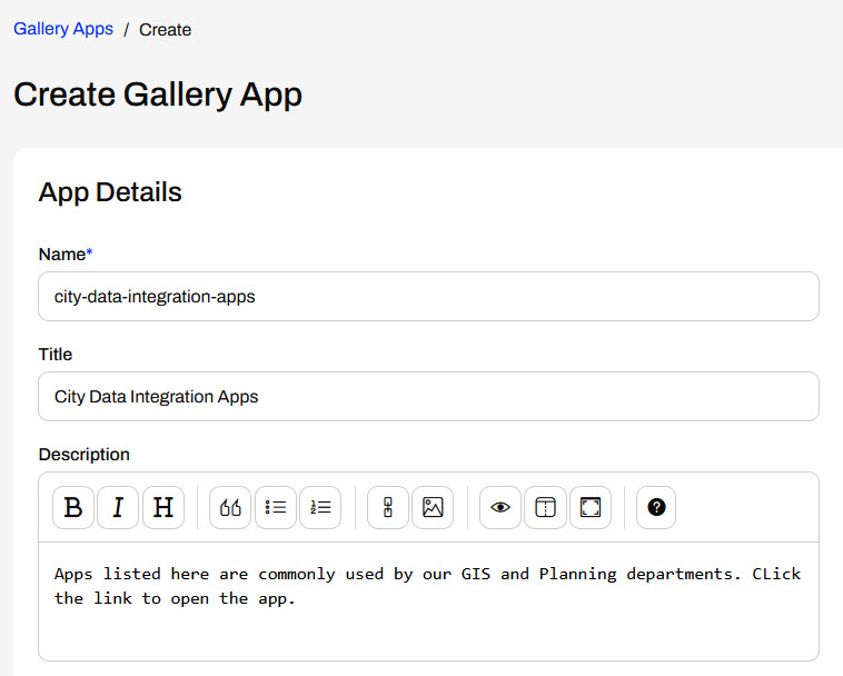 The Create Gallery App form opens. Frank gives his app a name, title, and description.