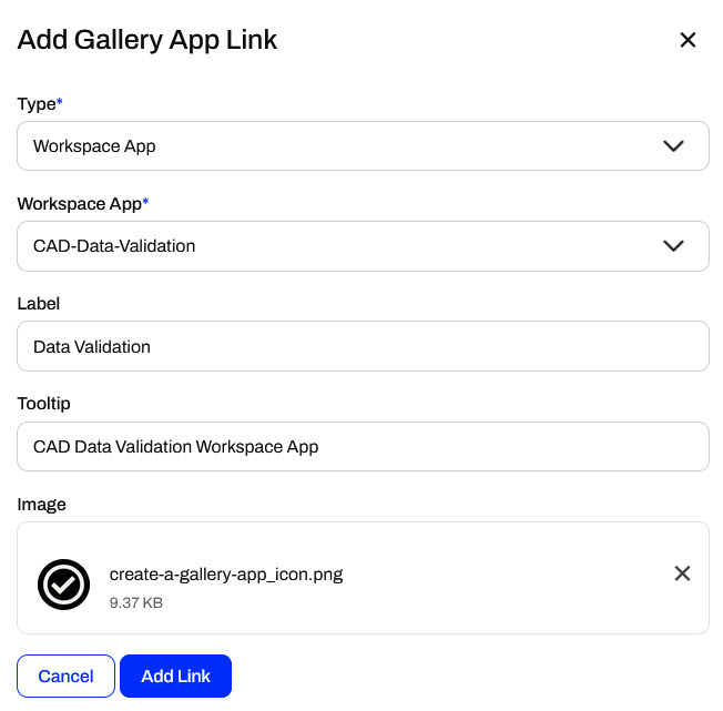 Frank selects Jennifer's CAD Data Validation Workspace App. He sets "Data Validation" for the Label and "CAD Data Validation Workspace App" for the Tooltip that displays when the user hovers over the link. To replace the default icon, Frank uploads the create-a-gallery-app_icon.png (C:\FMEData\Resources\FlowApps\create-a-gallery-app_icon.png) to replace the default Workspace App icon that displays on the Gallery App.