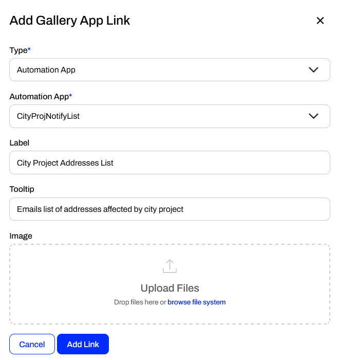 Frank selects Sven's Automation App called CityProjNotifyList. The Automation App triggers an Automation to send an email containing addresses near upcoming city projects. He fills out the Label and Tooltip. He doesn't add an image this time, the app link will show the default icon instead.