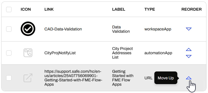FME Flow displays the links in the order that Frank adds them to the app. They will also display in this order on the Gallery App page. Frank wants the Flow Apps article to be the first link for the users in his app. In the Reorder column, Frank clicks Move Up twice for the URL link so that it is first in the list.