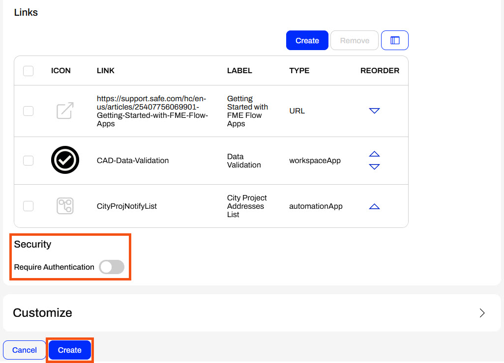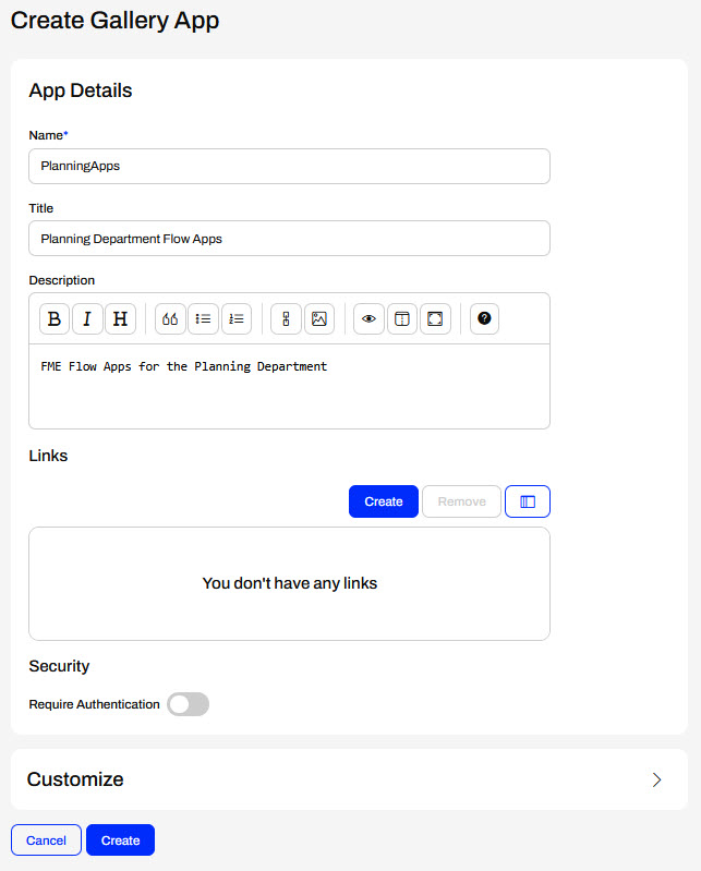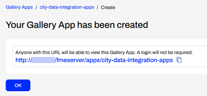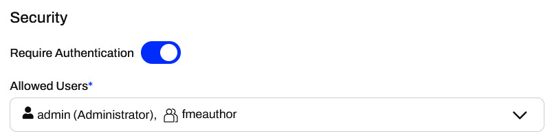 Gallery Apps may be publicly accessible, provided that your FME Flow is publicly accessible. Alternatively, you can turn on Require Authentication to restrict your app access to specific FME Flow users and roles.
