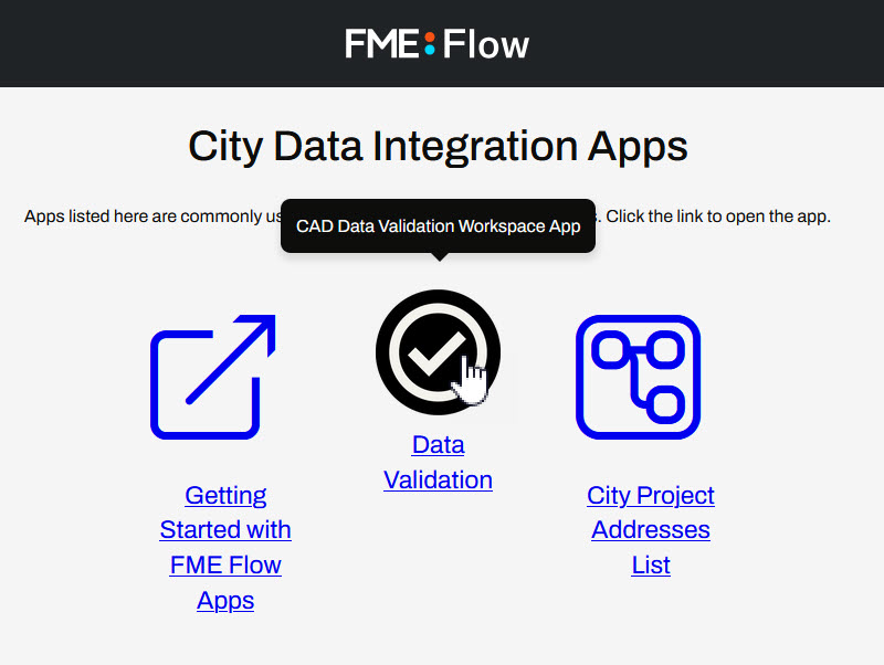 FME Flow displays the app URL to Frank, where he can copy it to share with colleagues or click to open it in a new tab. He opens the app and tests his links to the other apps and website.