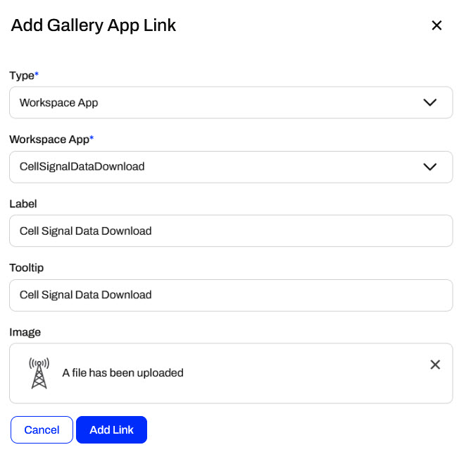 The Label appears beneath the image on the Gallery App, while the Tooltip text appears when you hover your mouse over the image. The image appears as an icon that you may select to open the link. If you do not add an image, FME Flow will display default images that reflect the Link Type.