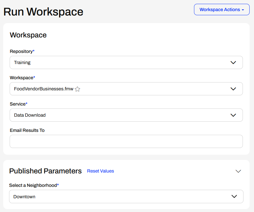 Frank navigates to and logs into his FME Flow. He opens the Run Workspace page and selects the Training repository. He then selects the FoodVendorBusinesses.fmw and sets it to the Data Download service. Under Published Parameters, Frank selects Downtown.