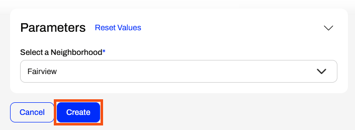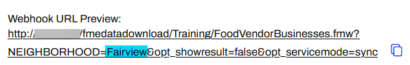 Frank scrolls down and expands Parameters. If he changes the neighborhood, the Webhook URL Preview immediately changes to reflect the parameter change.