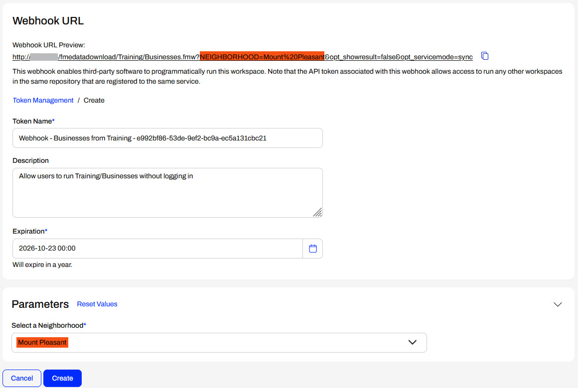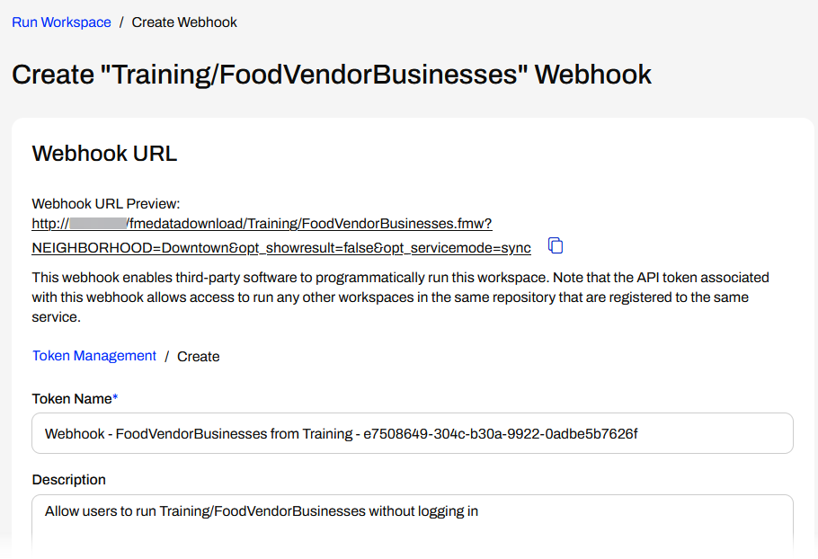 The Create Webhook page will open, where you create a token to grant permission to run the workspace through the webhook. There's also a Webhook URL preview that will update to match the Parameters you set.